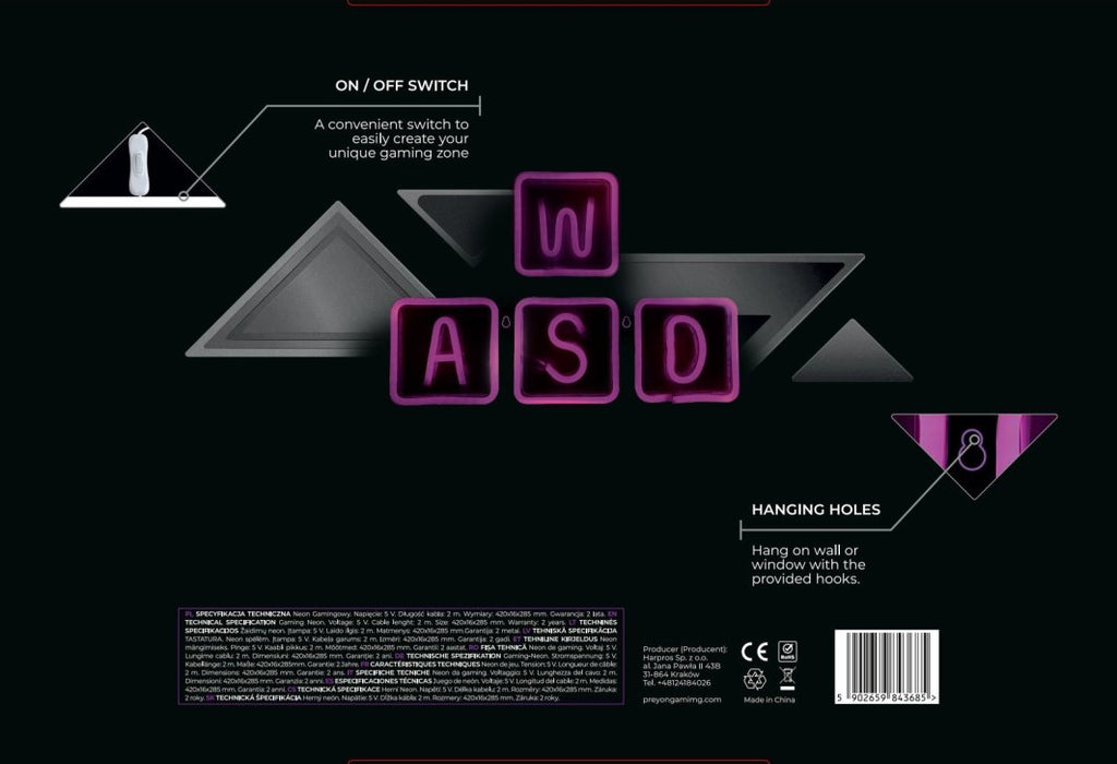 PREYON Purple Eye Bait PBEB28WD er et dekorativt neonskilt for vegg med fleksibel LED-stripe, designet spesielt for gamingrom og skrivebord. Skiltet etterligner de ikoniske WASD-tastene og lyser i en intens lilla farge, noe som gir gamingplassen et tydelig fokuspunkt og en unik visuell stil. Med dimensjoner på 420 x 16 x 285 mm passer dette neonskiltet like godt over skrivebordet, ved siden av skjermen eller i bakgrunnen av streamingoppsettet. Den integrerte LED-teknologien gir jevnt lys, lavt strømforbruk og lang levetid, perfekt for deg som vil ha et neonskilt wasd til gamingrom uten kompliserte løsninger.