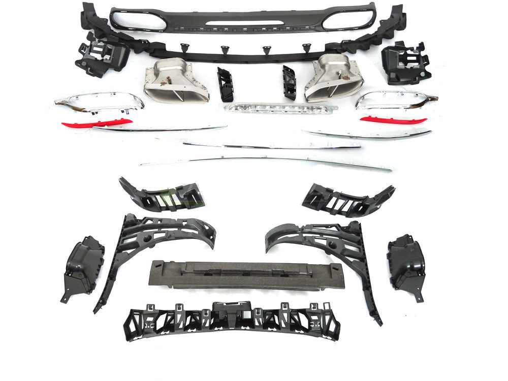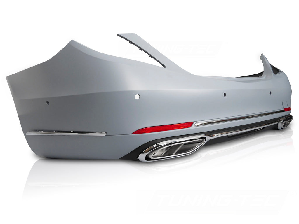 Bakfanger Mercedes S-klasse W222 2018-2020 i SPORT STYLE-design med PDC er en bakfanger i polypropylen som erstatter originaldelen og gir bilen et mer dynamisk utseende. Sport bakfanger Mercedes S-klasse W222 2018-2020 leveres som komplett sett med diffusor, eksosender og dekorstriper.