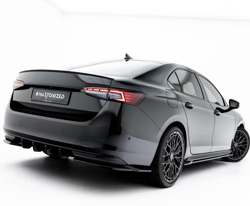 Oppgrader bakenden med bakre sidesplittere fra Maxton Design. Disse bakre sideforlengere gir et strammere og mer sportslig uttrykk, og kompletterer linjene på Skoda Superb Sportline Mk4. Som bakre skjørtforlengere bidrar de til en mer aerodynamisk look uten å gå på kompromiss med daglig bruk.