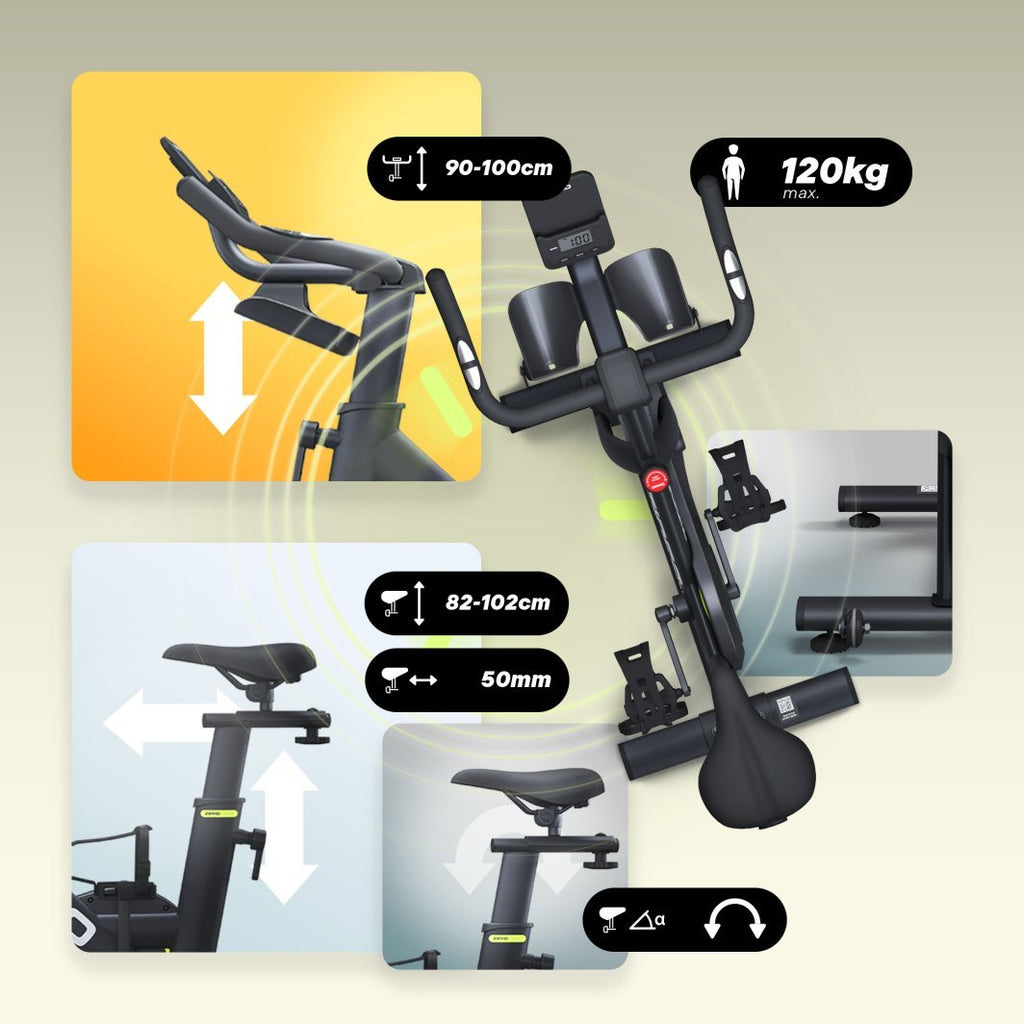 Som treningssykkel er ZIPRO Modo utstyrt med et magnetisk motstandssystem som gir jevn, stille og behagelig tråkkmotstand uten rykk og støy. Motstanden justeres manuelt og trinnløst med et lett tilgjengelig justeringshjul, slik at du enkelt kan tilpasse intensiteten underveis i økten. Sete og styre har et bredt justeringsområde i høyde og dybde, slik at spinningsykkelen kan tilpasses ulike kroppshøyder og kjørestiler. Den multifunksjonelle styrekonstruksjonen gir flere håndposisjoner, og to flaskeholdere ved styret gjør det enkelt å ha drikke lett tilgjengelig. I tillegg har sykkelen en praktisk holder for nettbrett eller telefon, slik at du kan bruke treningsapper, følge virtuelle løyper eller se serier mens du trener på denne stasjonære spinningssykkelen for intensiv trening.