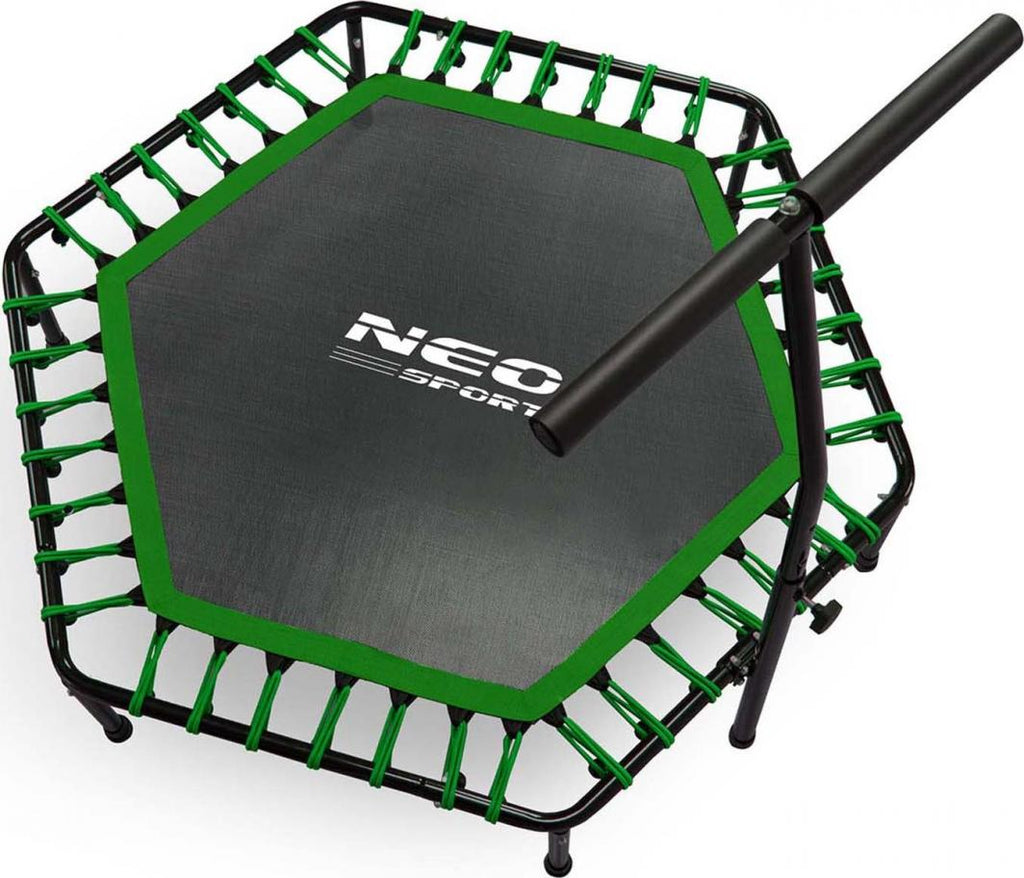 Denne trampolinen er spesielt tilpasset intensiv fitness- og intervalltrening. En robust stålramme kombinert med 42 elastiske gummistrikker som strammer opp matten, sørger for dynamisk, men skånsom fjæring for leddene. Den sekskantede formen gir god plass på hoppeflaten, samtidig som totaldiameteren på 127 cm gjør den enkel å plassere som en liten fitness trampoline til hjemmetrening. Håndtaket har tre høydeinnstillinger (ca. 99, 107 og 118 cm) og er utstyrt med skum for godt grep, slik at denne innendørs fitness-trampolinen med håndtak passer brukere med ulik høyde og treningsnivå. Seks ben med antisklihetter, samt et ekstra ben til håndtaket, gir høy stabilitet under hopp og raske bevegelser.