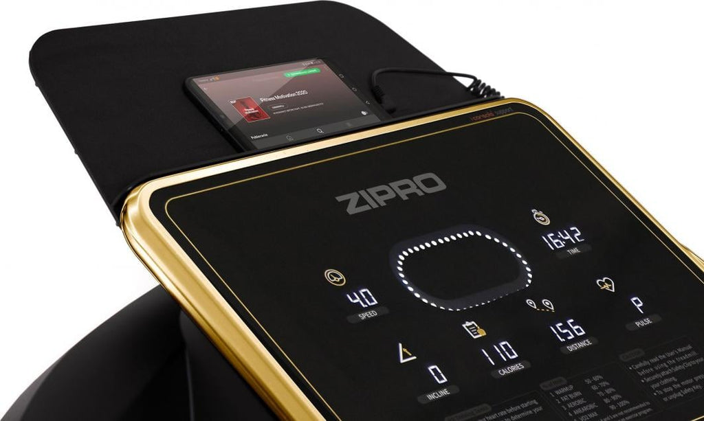 Zipro Pacemaker Gold er en elektrisk tredemølle til hjemmetrening utviklet for alt fra rolig gange til raske løpeturer. Den kraftige motoren, den store løpeflaten og den solide, stabile konstruksjonen gjør den godt egnet for både nybegynnere og mer erfarne løpere som vil trene effektivt hjemme i stuen, på hjemmekontoret eller i eget treningsrom. Det sorte og gullfargede designet gir et moderne og eksklusivt uttrykk som passer inn i et stilrent interiør, samtidig som løpebåndet har god demping og sklisikker overflate for trygg og komfortabel trening.